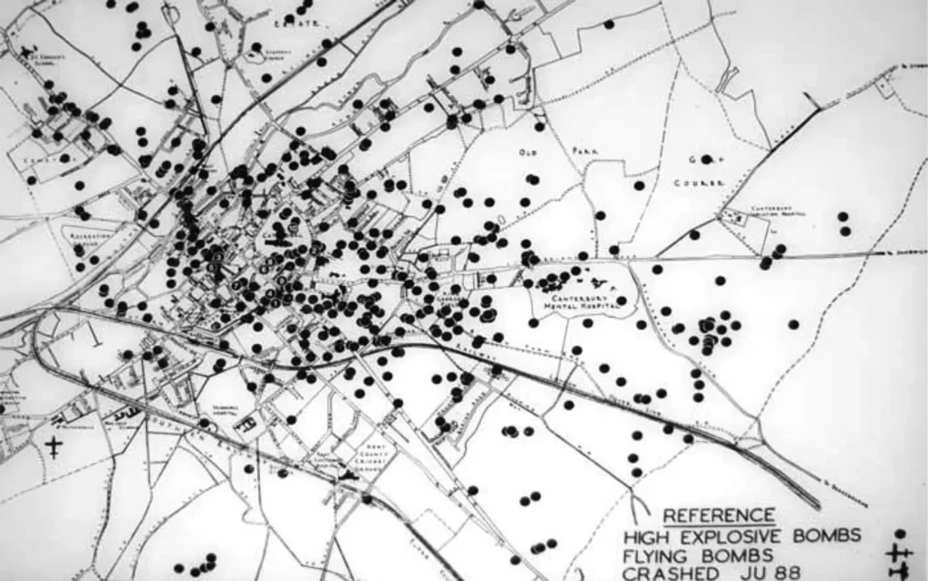 Canterbury was the target of several air raids during the Second World War. One of these, which became known as the Baedeker Raid, took place on the night of June 1st 1942. That night saw around 10,000 incendiary bombs and 445 high explosive bombs land on the city. Although St Stephen’s didn’t see the same level of destruction as the city centre saw, several devices fell around the local area. The map below shows where high explosive bombs fell, including one on the northern edge of St Stephen’s churchyard.